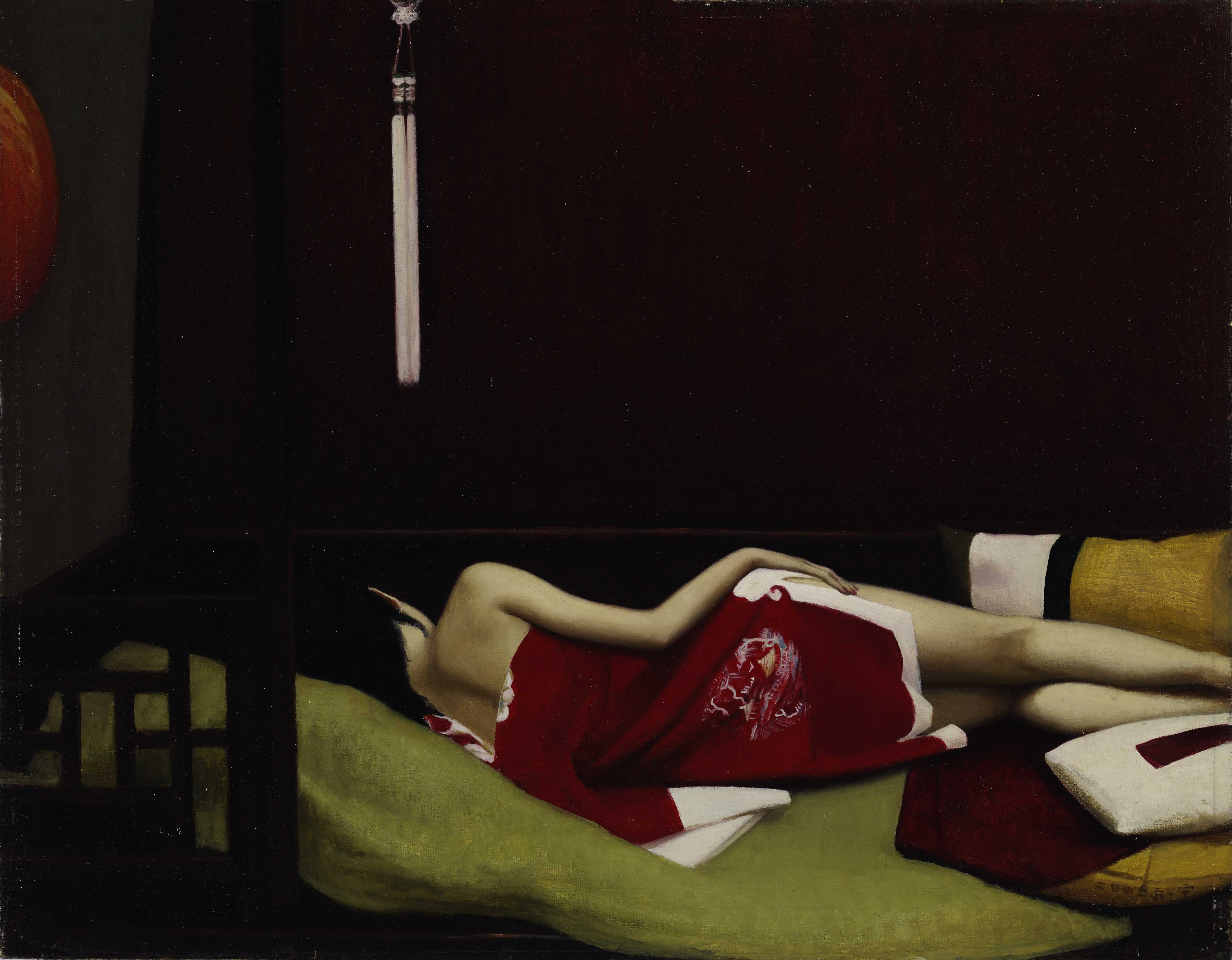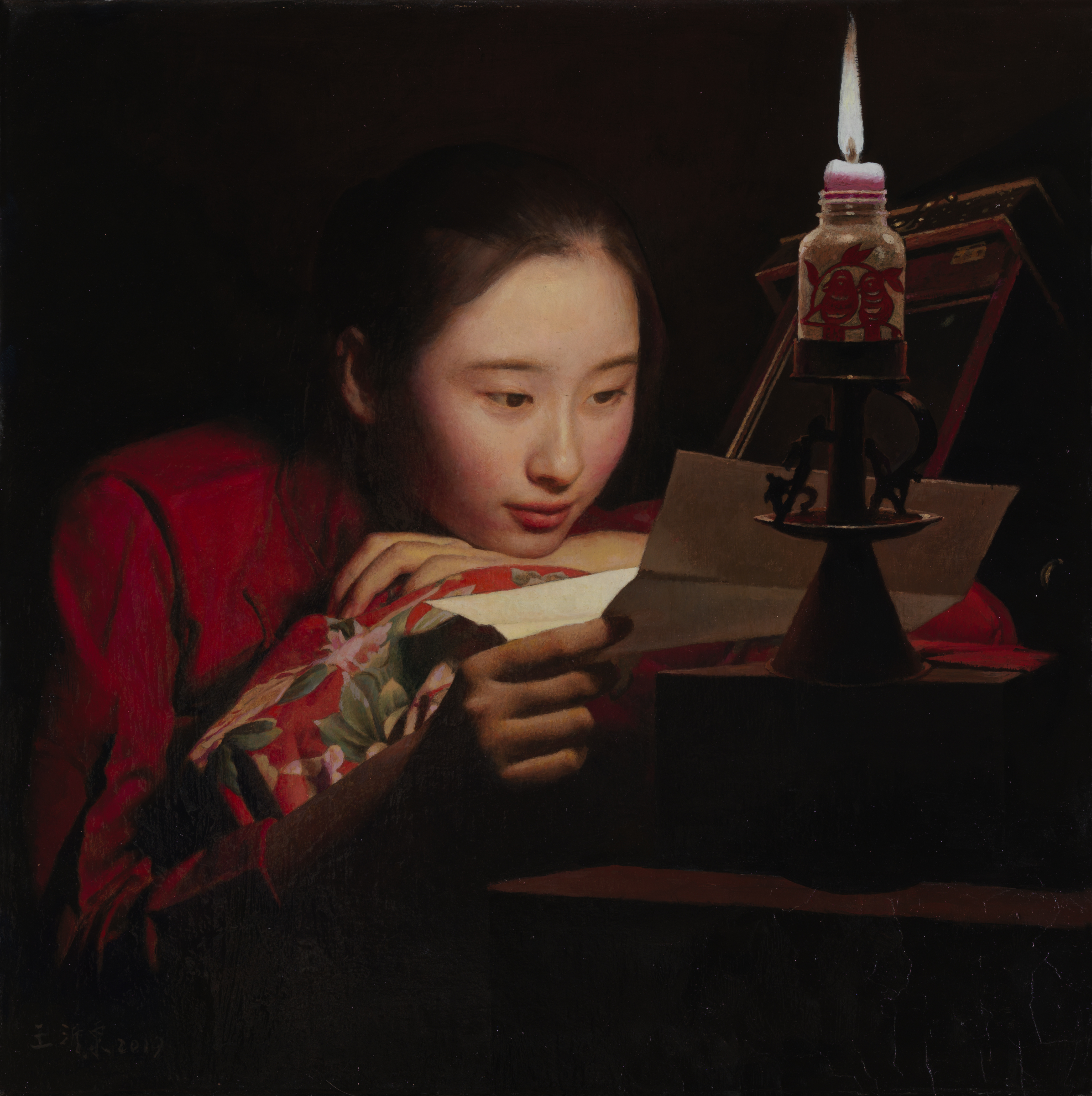 蜡烛光作为唯一的光源,其微弱的光芒恰到好处地照亮了女子的脸庞,她的脸颊上浮现出一抹淡淡的红晕,眼神中也展露出一种特别的柔和。从画中人的表情中,我们感觉到一种“淡淡的幸福”。这种幸福是有浓度的,是一种“有温度”的感觉,画家通过安排光线,场景,还有构图上的考量,把握到了人物在此情此景中的内在状态和心绪。蜡烛上两只比翼双飞的小鸟,和她身上红色的嫁衣,从一个侧面告诉了我们这位主人公的身份,那么这张“家书”中所述的内容,我们大概就很容易想到了。