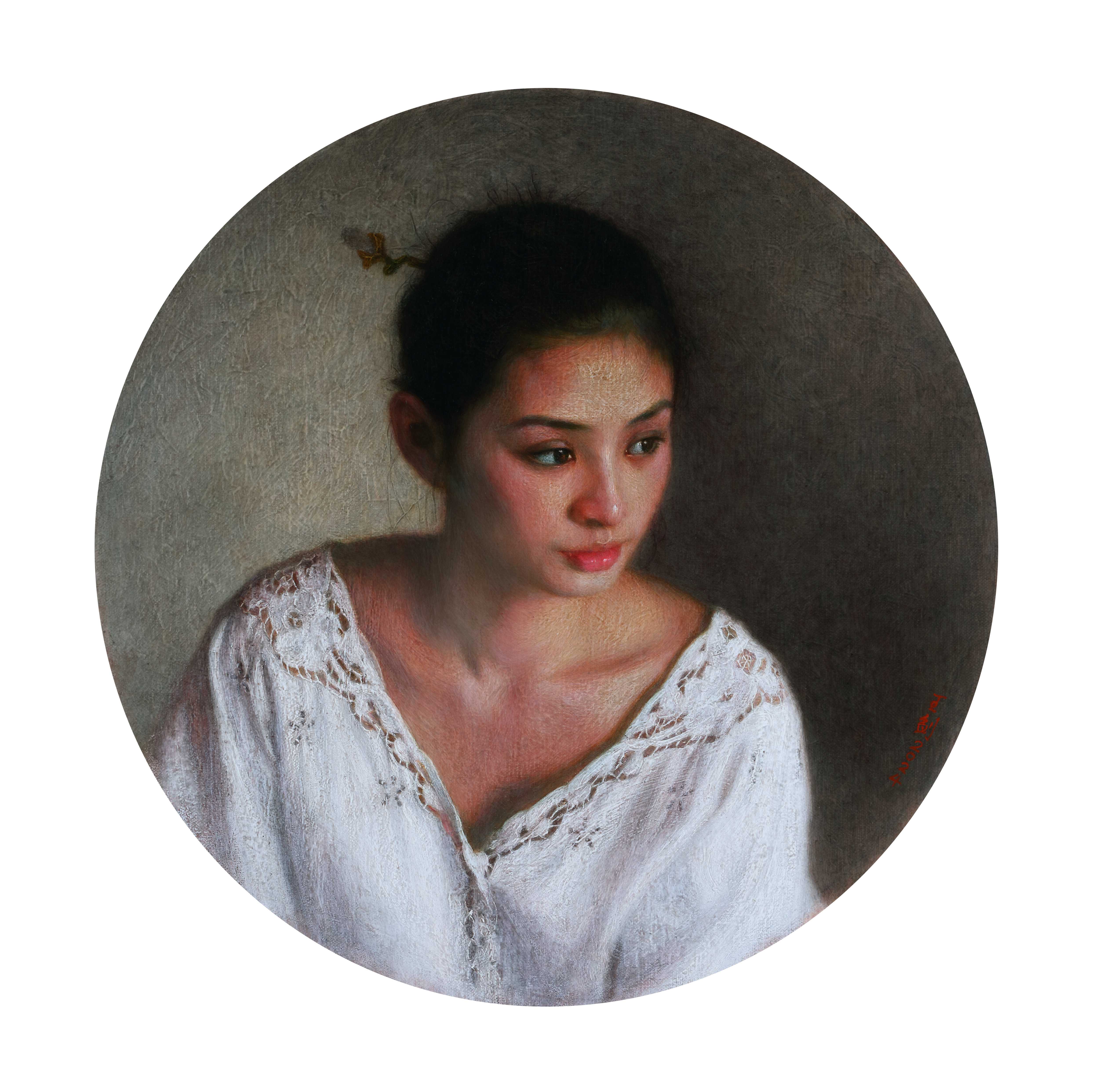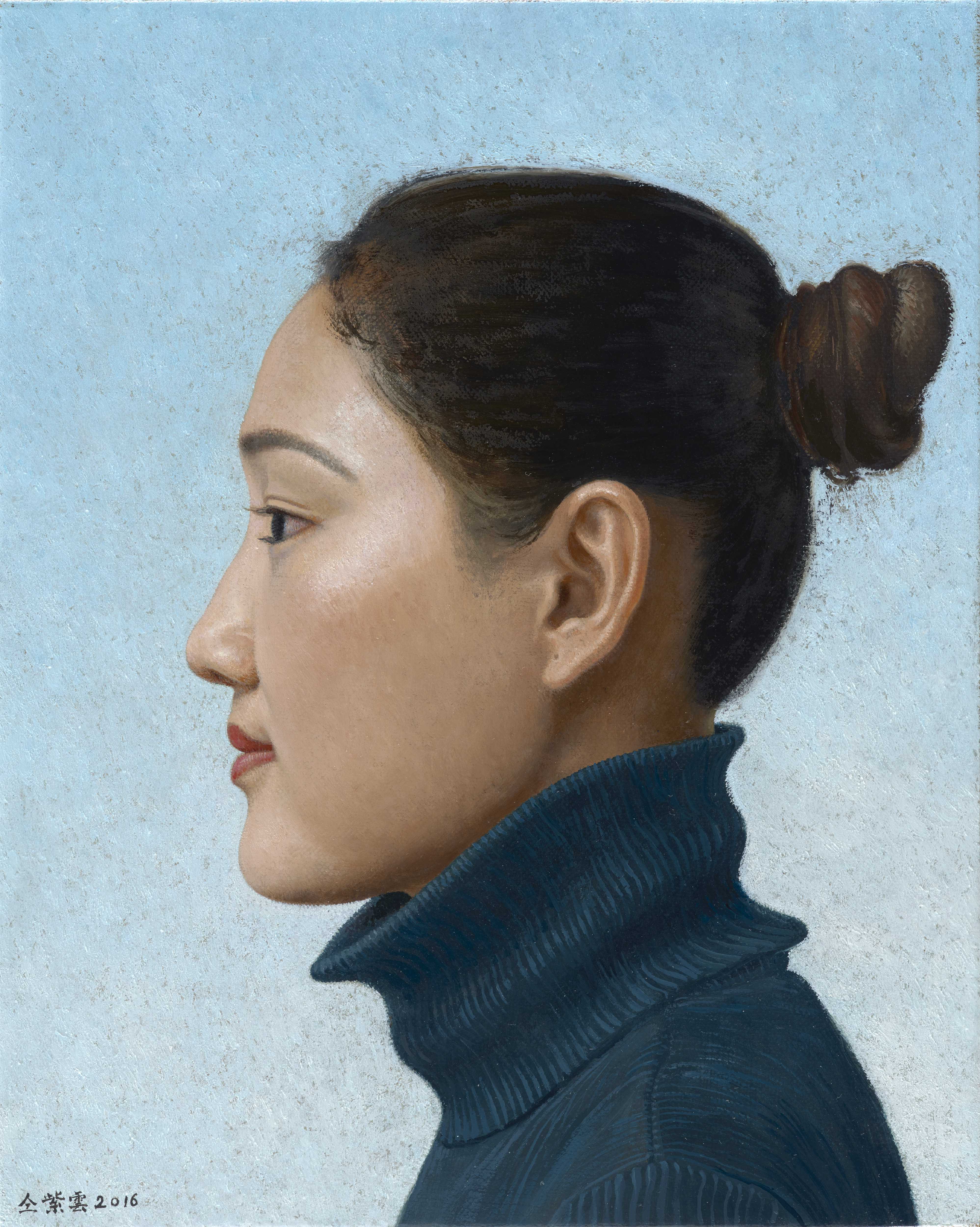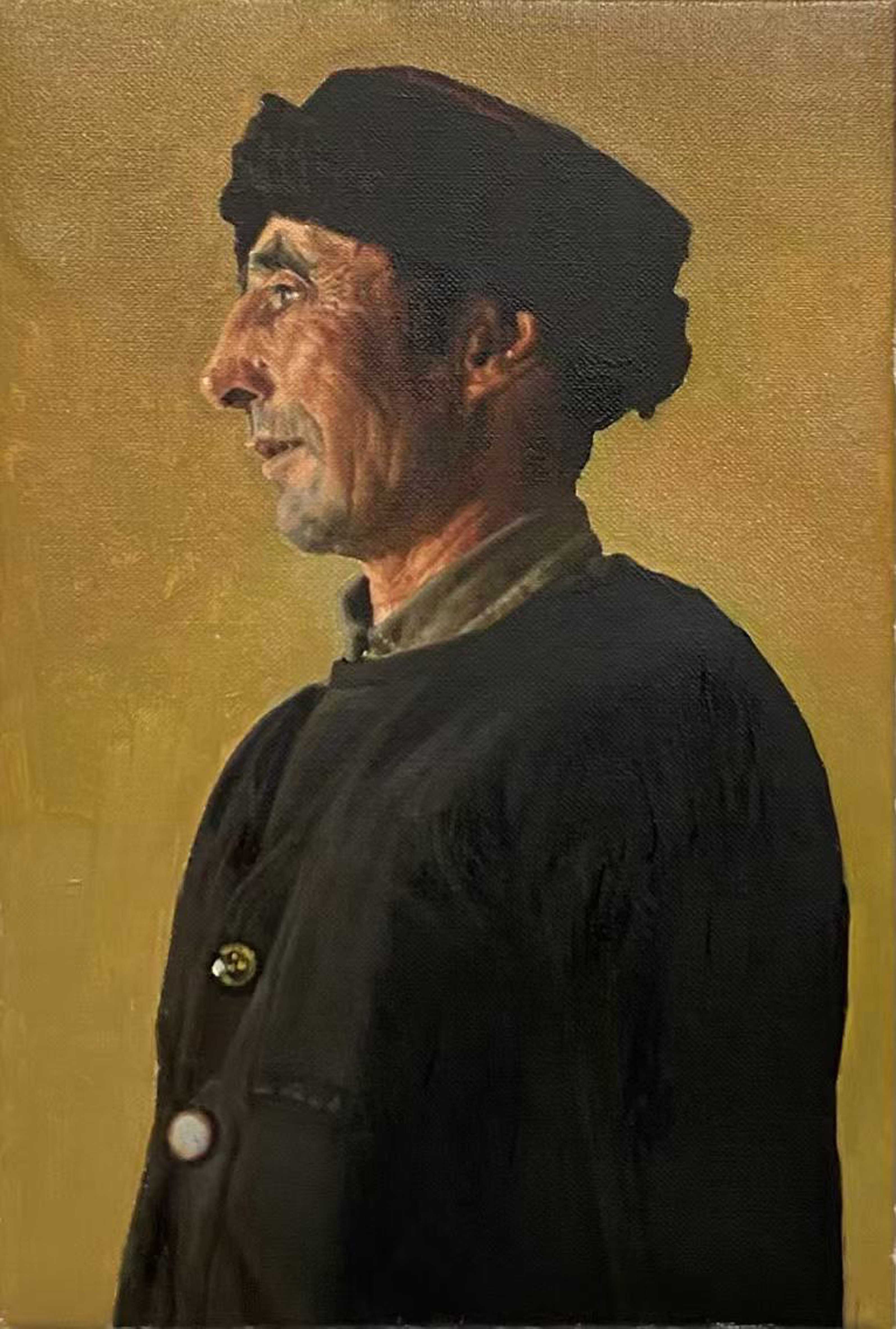 创作札记:画中这位模特的造型,和汉代陶俑的感觉有些接近。我们学习油画的过程中,经典的范本描绘的都是西方面孔,如何创作出具有中国人典型特征的肖像画,一直是我关注的问题。我想,在中华大地上生活的人,虽然有迁徙,但想必和古人地相貌总会有相似的类型。秦汉陶俑造型中的人物,应该也是对现实生活的表现,也总有人在秦俑中找到和现今人物极为相似的面孔。当时我正在研究汉代雕塑造型,遇到了这位模特,她的面相和汉俑有几分神似,于是结合文艺复兴式的侧面肖像风格,用写生的方式完成了这幅肖像画。这样的研究有十几幅,很多都还没有完成。