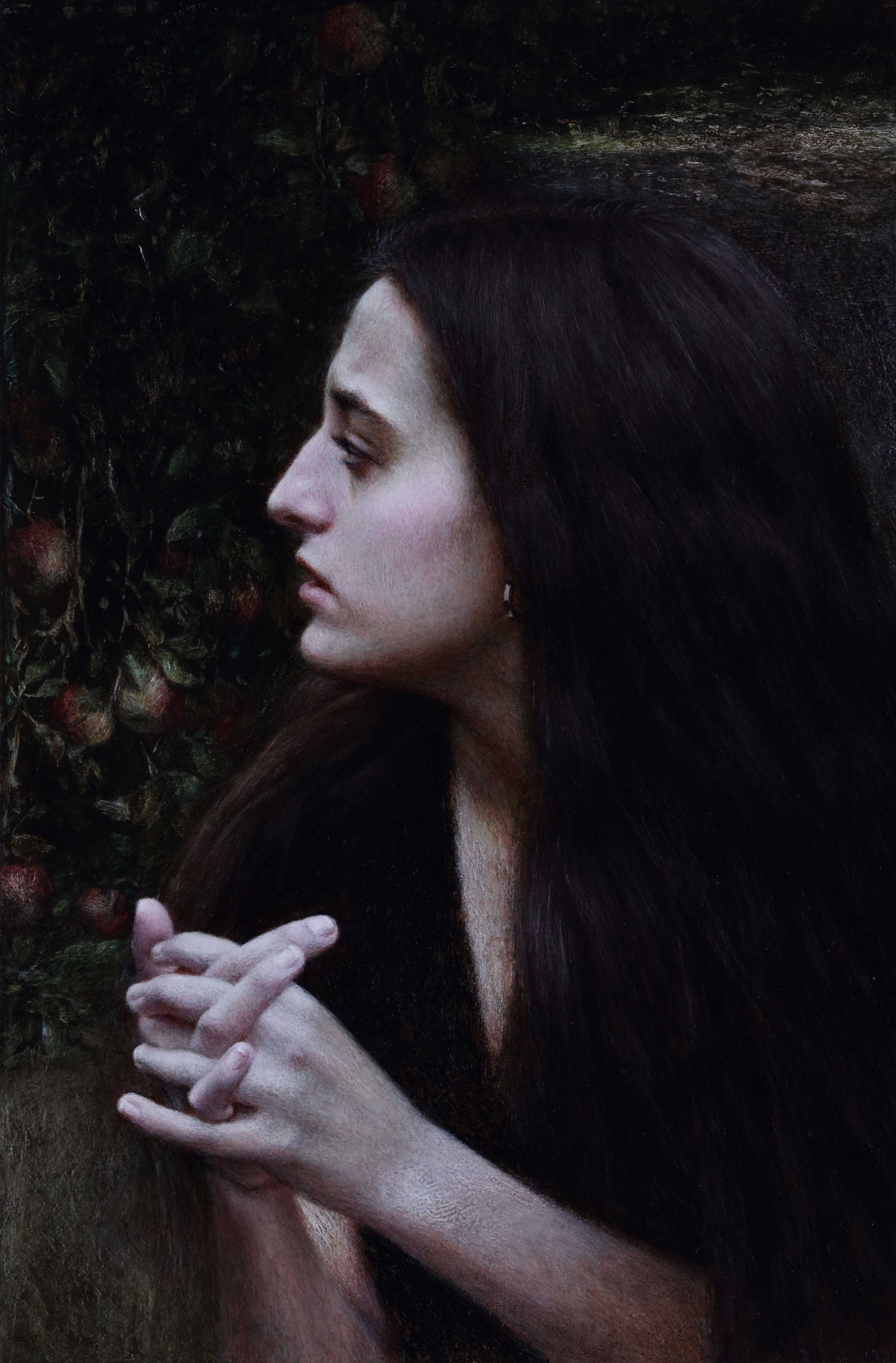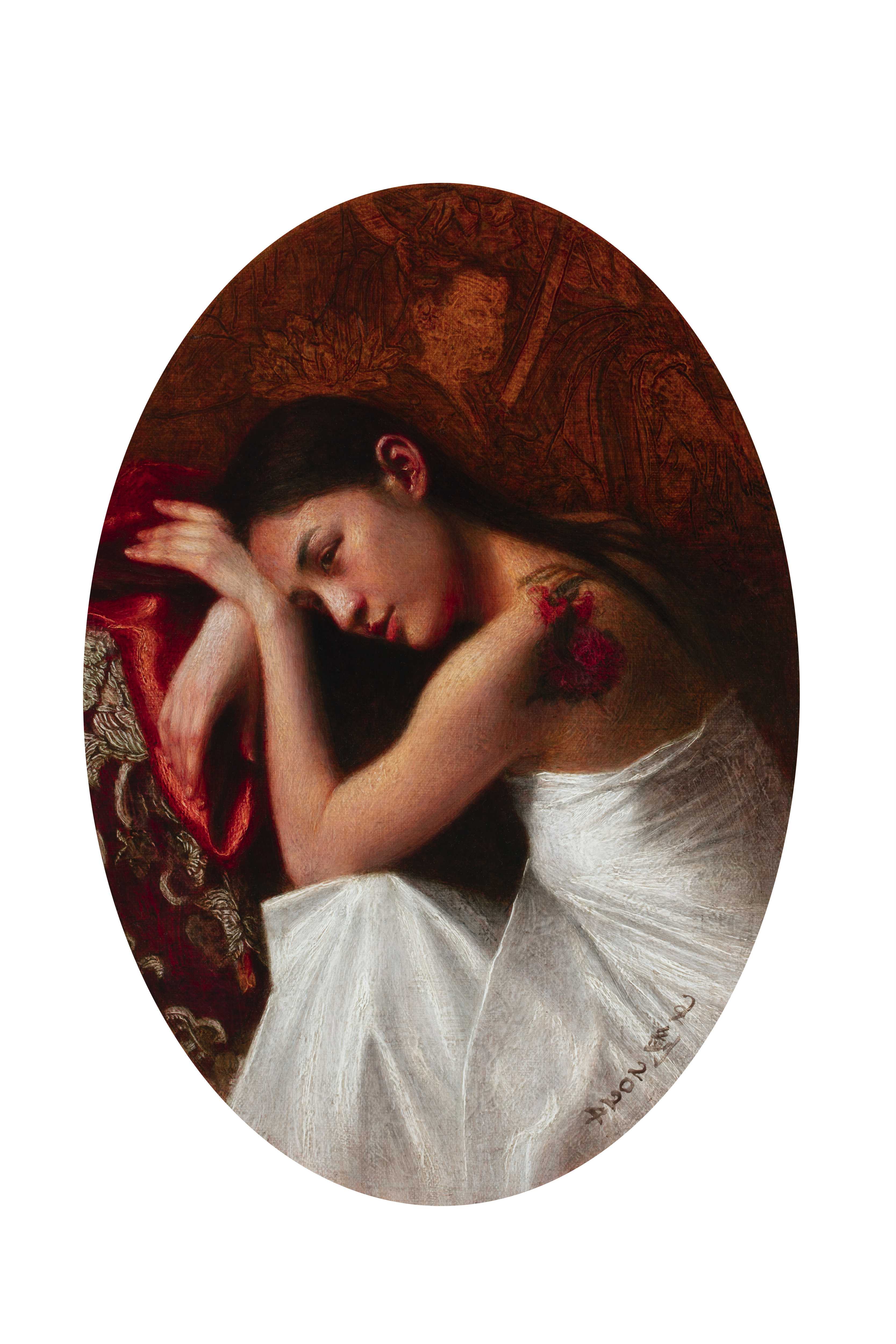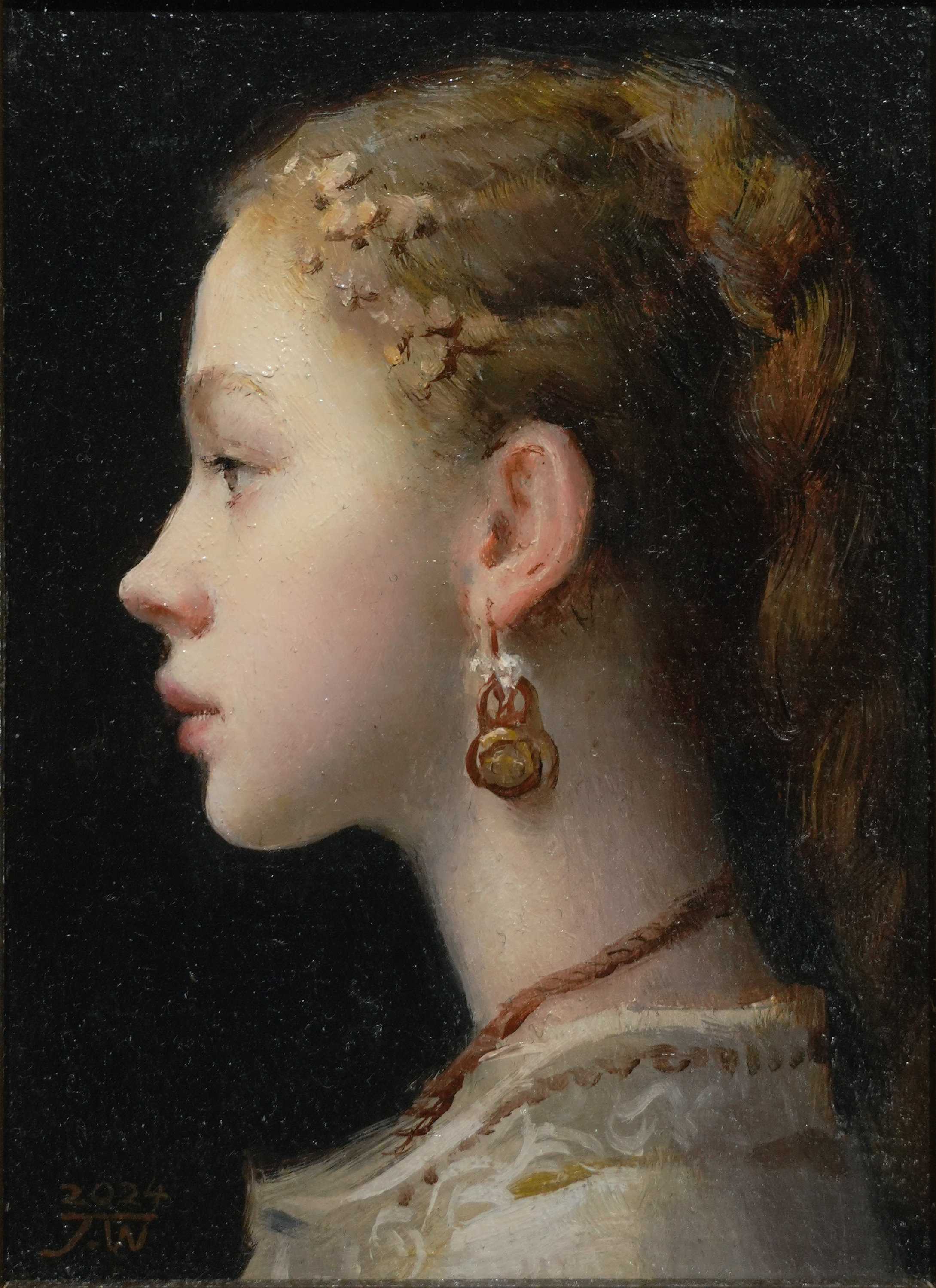 创作札记:画中这位模特的造型,和汉代陶俑的感觉有些接近。我们学习油画的过程中,经典的范本描绘的都是西方面孔,如何创作出具有中国人典型特征的肖像画,一直是我关注的问题。我想,在中华大地上生活的人,虽然有迁徙,但想必和古人地相貌总会有相似的类型。秦汉陶俑造型中的人物,应该也是对现实生活的表现,也总有人在秦俑中找到和现今人物极为相似的面孔。当时我正在研究汉代雕塑造型,遇到了这位模特,她的面相和汉俑有几分神似,于是结合文艺复兴式的侧面肖像风格,用写生的方式完成了这幅肖像画。这样的研究有十几幅,很多都还没有完成。