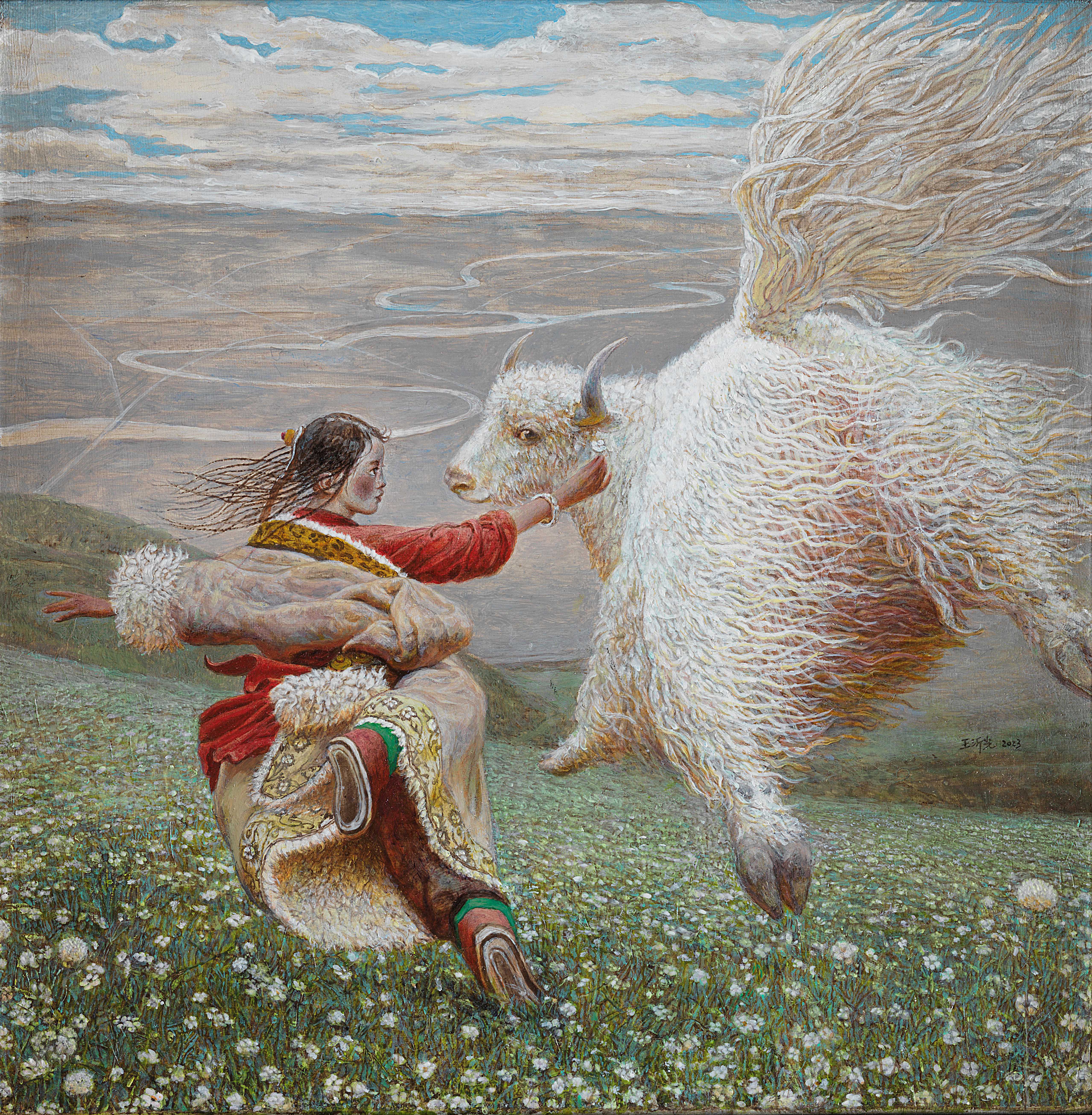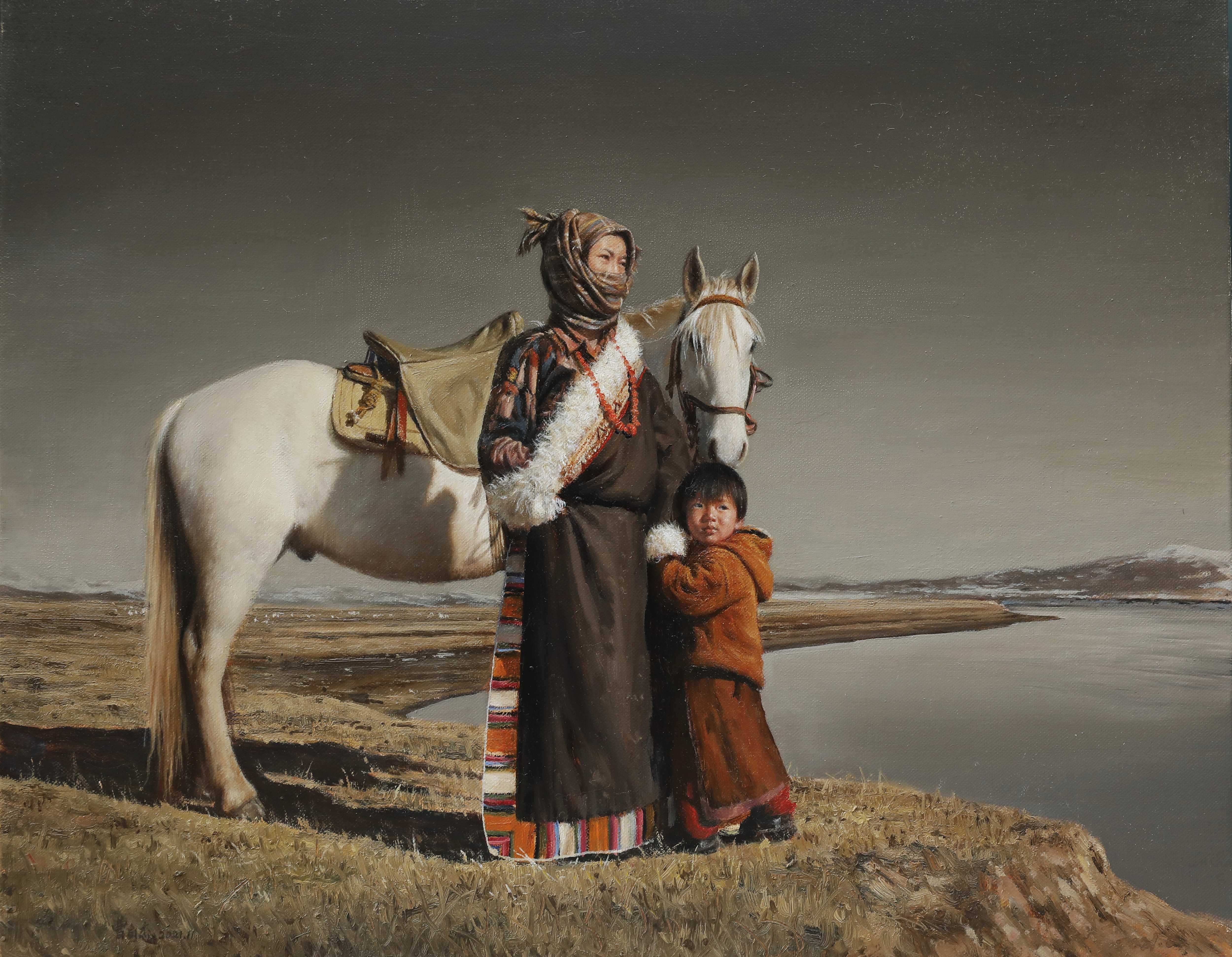 创作札记:在这幅名为《守望》的油画中,若尔盖草原湿地保护区的辽阔天地间,一位藏族母亲牵着马,怀抱着孩子,凝视着远方。画面中,母亲的面庞透露出一种深沉而坚定的神情,她的眼神中既有对远方亲人的无尽思念,也有对家园的坚守与热爱。马儿静静地站在一旁,仿佛也在感受着这份深情与期盼。草原上的每一根草、每一朵花,都在诉说着岁月的静好与时光的流转。这幅画以淡雅的色调和细腻的笔触,勾勒出了一幅充满诗意的景象。母亲与孩子之间的温情,以及他们对未来的憧憬,构成了画面的核心。在苍茫的草原背景之下,这份温情显得尤为珍贵。画面中的每一个细节,都仿佛在低语,讲述着一个关于爱、希望与坚持的故事。