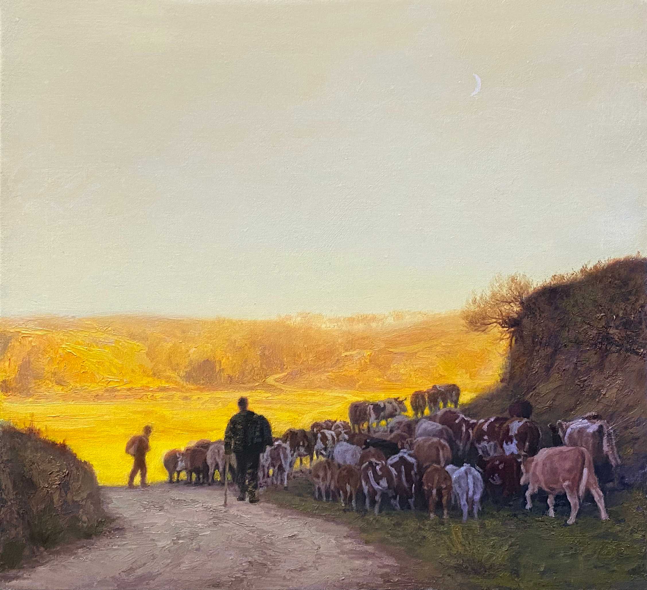 创作札记:《牧归图》是历代画家们常画的题材,我去山西右玉写生,傍晚在回去的路上恰巧碰上了这个场景,主要是当时的逆光的光影关系,还有山西右玉的地理特征,美到极致了,一下子让我激动了起来,我跟着牛群拍了很多片子,非常兴奋,终于拍到了好的资料,回去一定能画出一幅好作品。