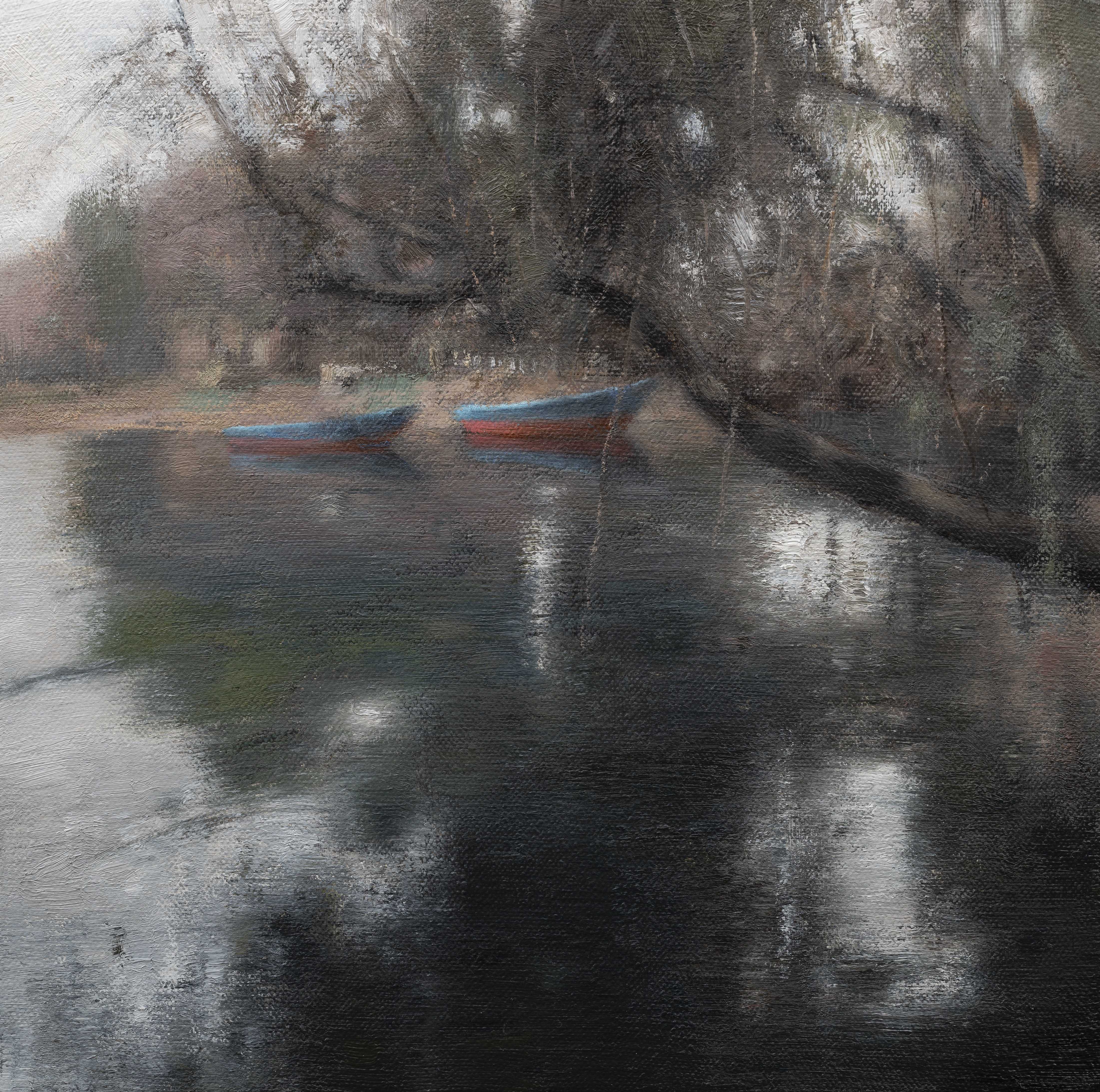 技法上,我采用厚涂与刮擦相结合的方式,增强了树干与背景之间的层次感,同时利用明暗对比强化了视觉中心的戏剧性效果。粗犷的笔触在树影部分呈现出一种有机的纹理感,而中央涟漪部分则以流动的线条对比出细腻与柔和,形成强烈的视觉冲击。