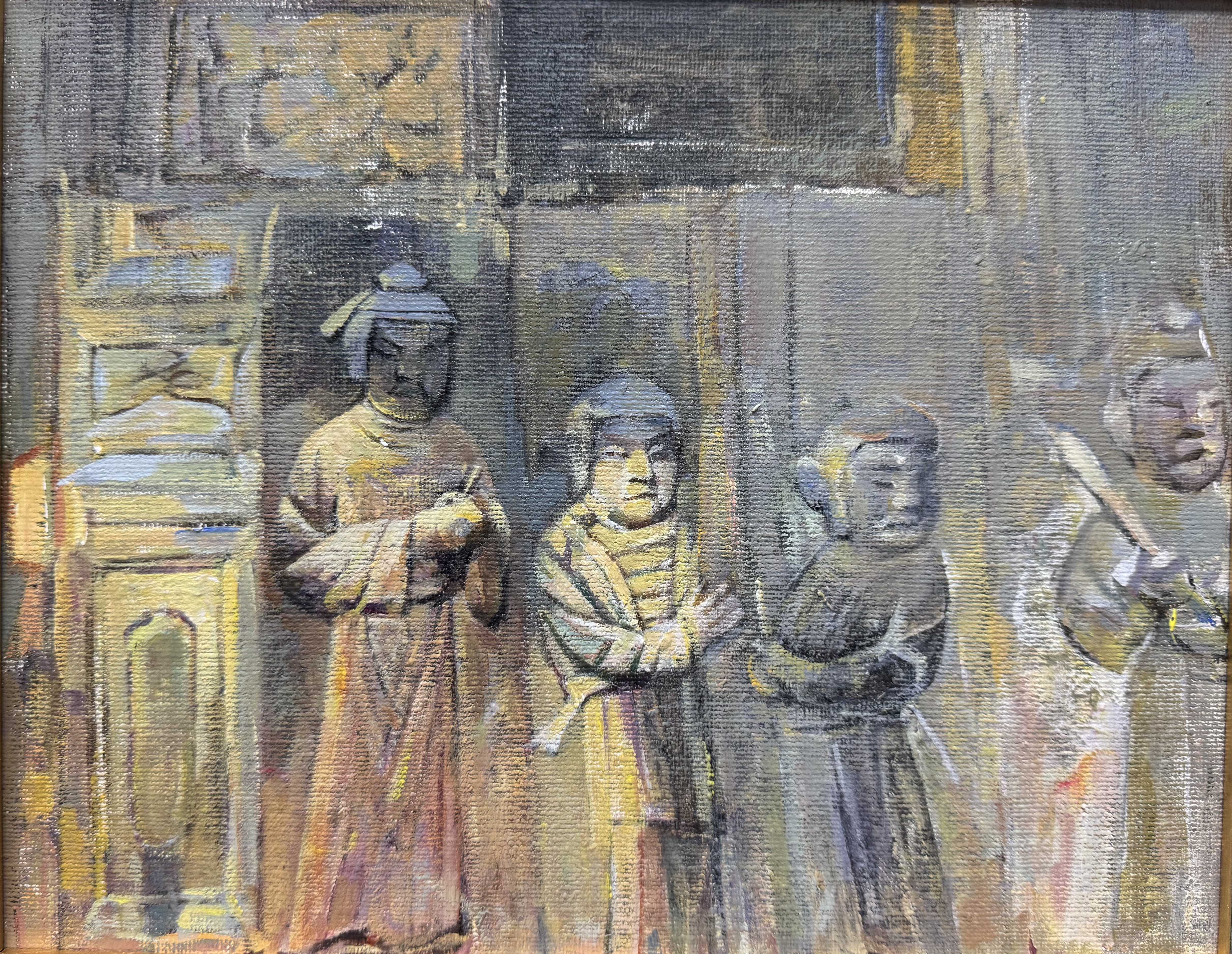 这五幅作品为系列作品,分别表现为远古人们欢乐祥和的情景剧,尺寸不大,意义深远。取材是通过古代壁画内容借助写生记录,转译成现在的样子。所有的人都把继承传统挂在嘴边,继承什么?从哪里切入,我选择了传统雕塑中的内容。这些内容在今天看来都非常有借鉴与传承的意义。今天的快节奏和图像泛滥,希望自己和这一系列的作品能存人文关怀而且不仅是这些......
