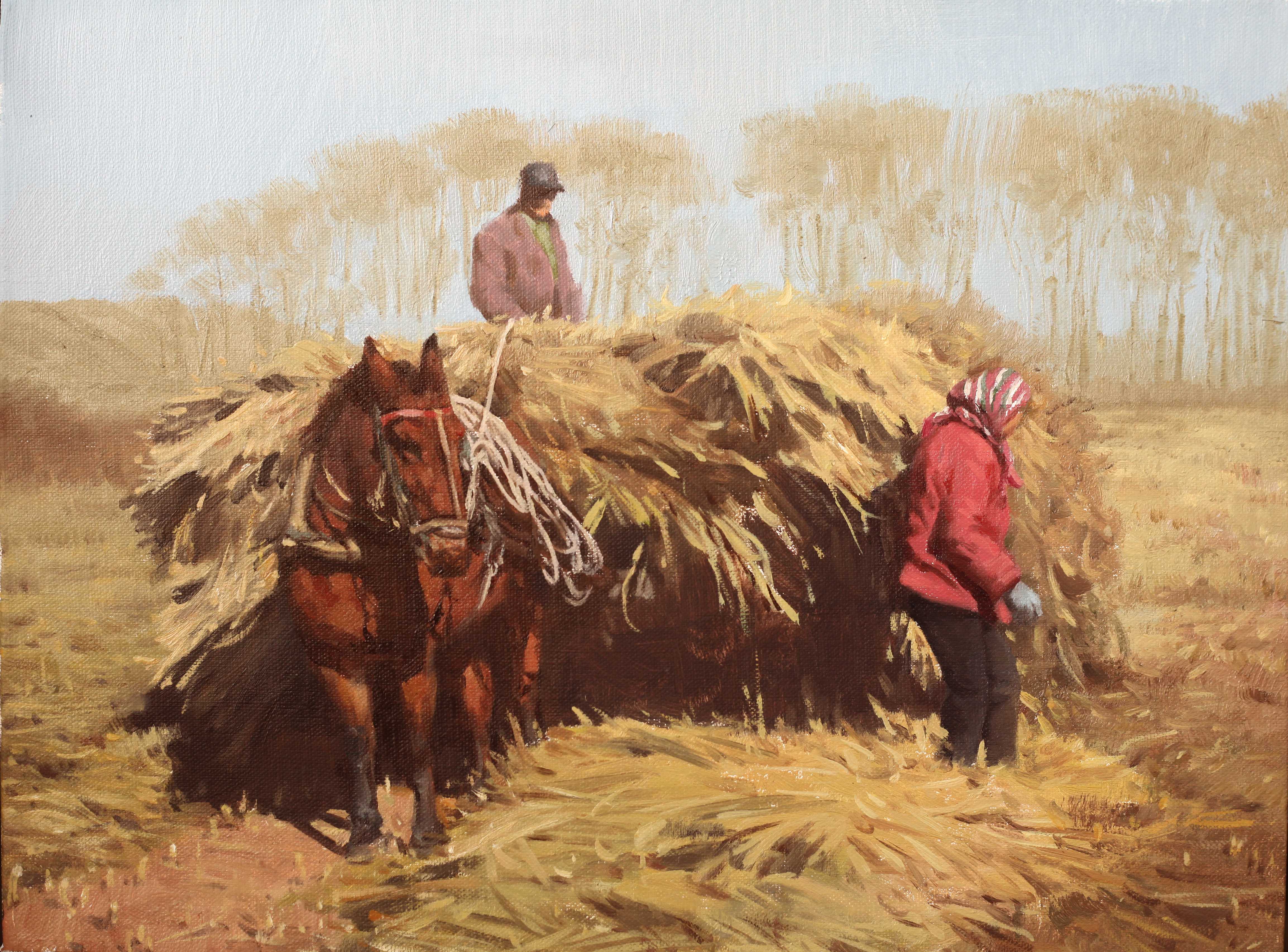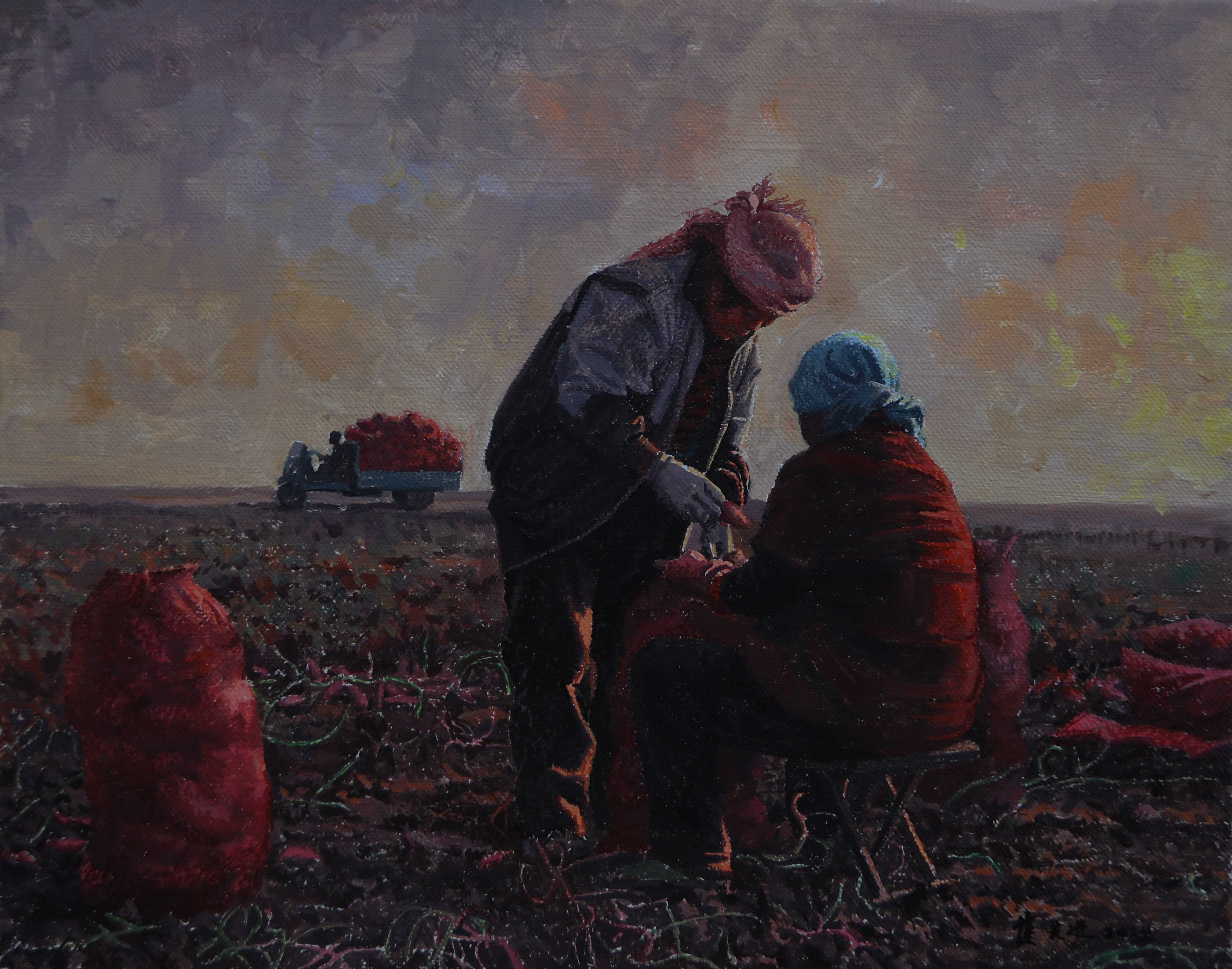 创作札记:暮色是指傍晚昏暗的天色,暮色暗示着一天的劳动结束,早出暮归,沐浴着夕阳。田野里的收获也渐渐到了尾声,一天的劳累在满袋满袋的农作物面前显得好像不再那么重要,最后一份力气也随着最后的收获,永远留在了那片一望无际寂静的田野上。远处装满作物归家的车, 以及夕阳照射下被收获的土地上正在收拾作物的劳动者,整个画面沐浴在暮色中,寂静的田野里都是收获的希望。