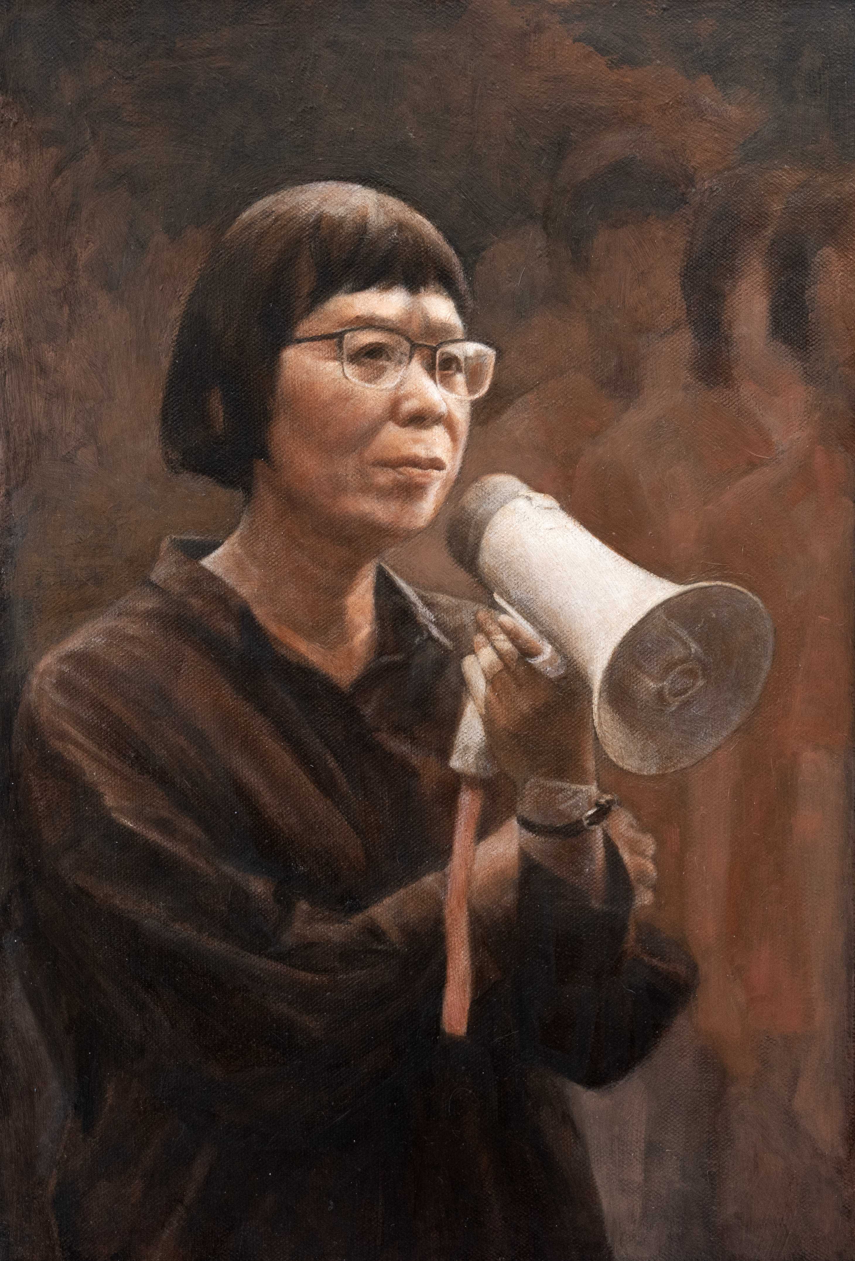 《张桂梅组画之一》是表现张桂梅校长坚持几十年如一日每天黎明时分用喇叭喊学生起床上早课,体现出她的辛勤付出和操劳。