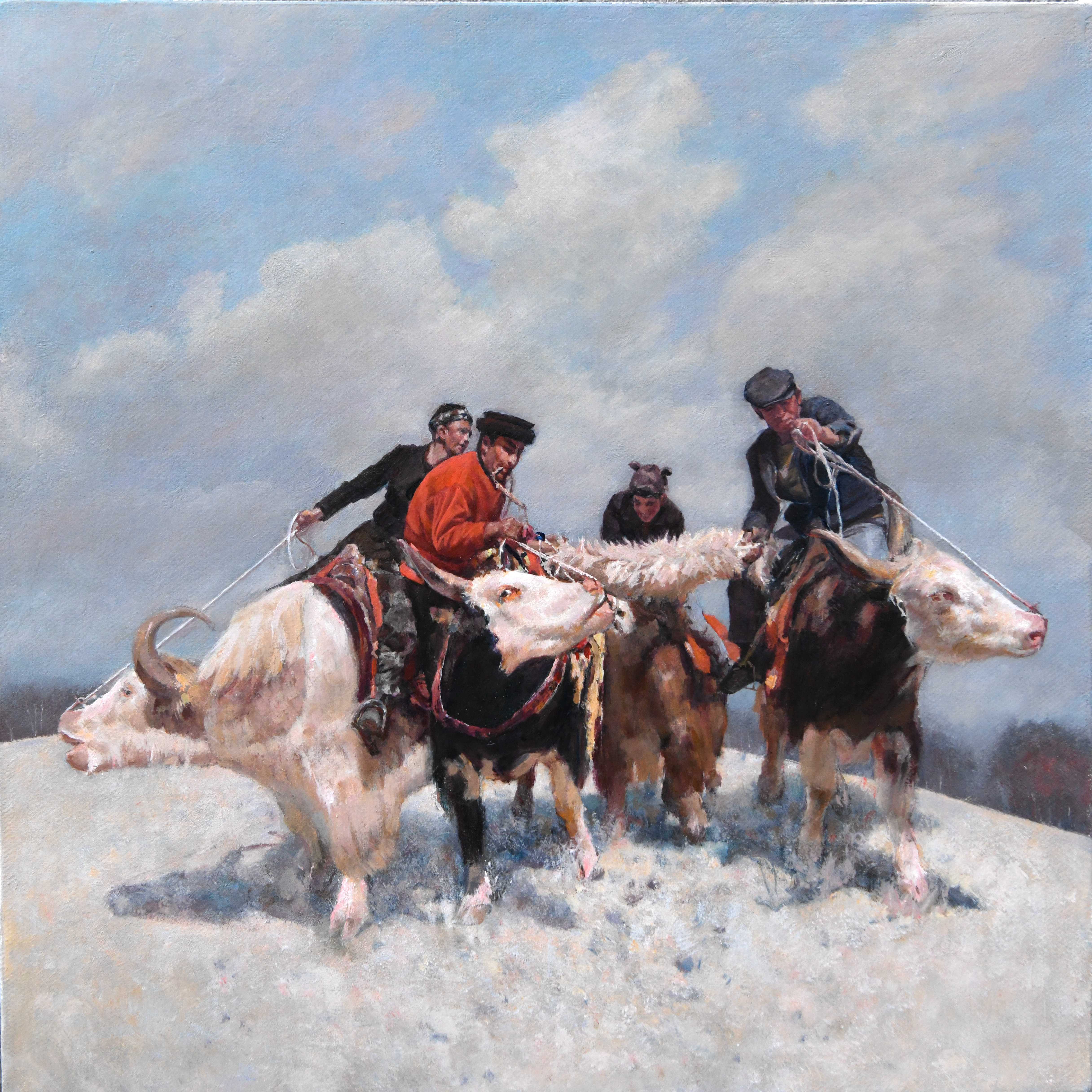 创作札记:《牦影云骁》这幅油画旨在展现塔吉克牧民于帕米尔高原雪地中进行叼羊活动的独特魅力与豪迈风情。
