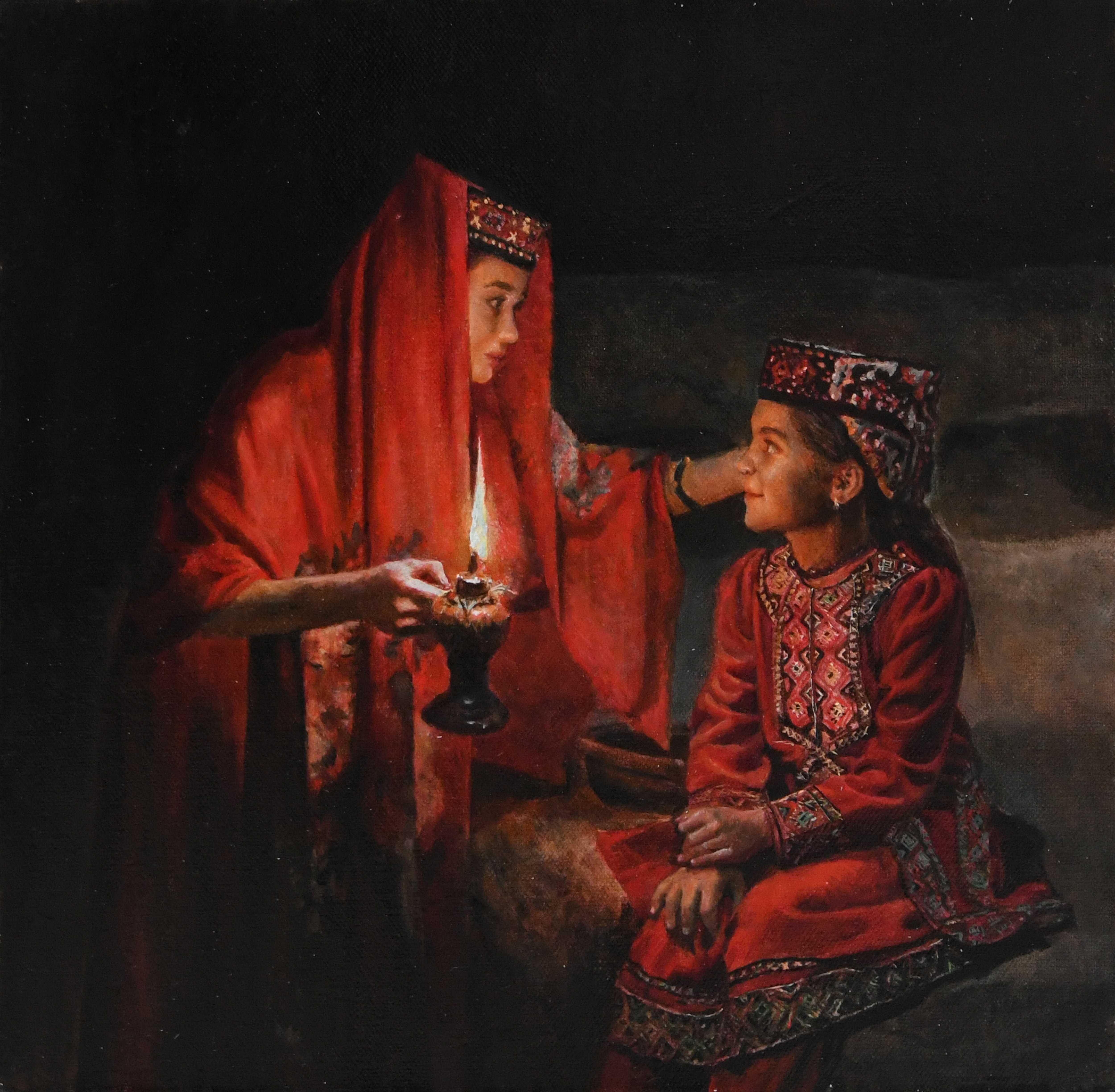创作札记:在这幅名为《烛映情》的油画中,我试图捕捉一个宁静而充满深情的瞬间。画面聚焦于一对身着红色民族服饰的塔吉克母女,她们置身于一座老房子里,唯有烛光摇曳,照亮彼此的面庞,目光交汇间,似有千言万语默默流淌。选择塔吉克民族服饰,是因其独特的红色调与精美的刺绣花纹。红色,在视觉上极具冲击力,它不仅象征着塔吉克族的热情与活力,更在烛光的映照下,焕发出一种温暖而神秘的光芒。这种色彩的运用,旨在烘托出画面中浓郁的情感氛围,使母女二人仿佛被爱与温情环绕。