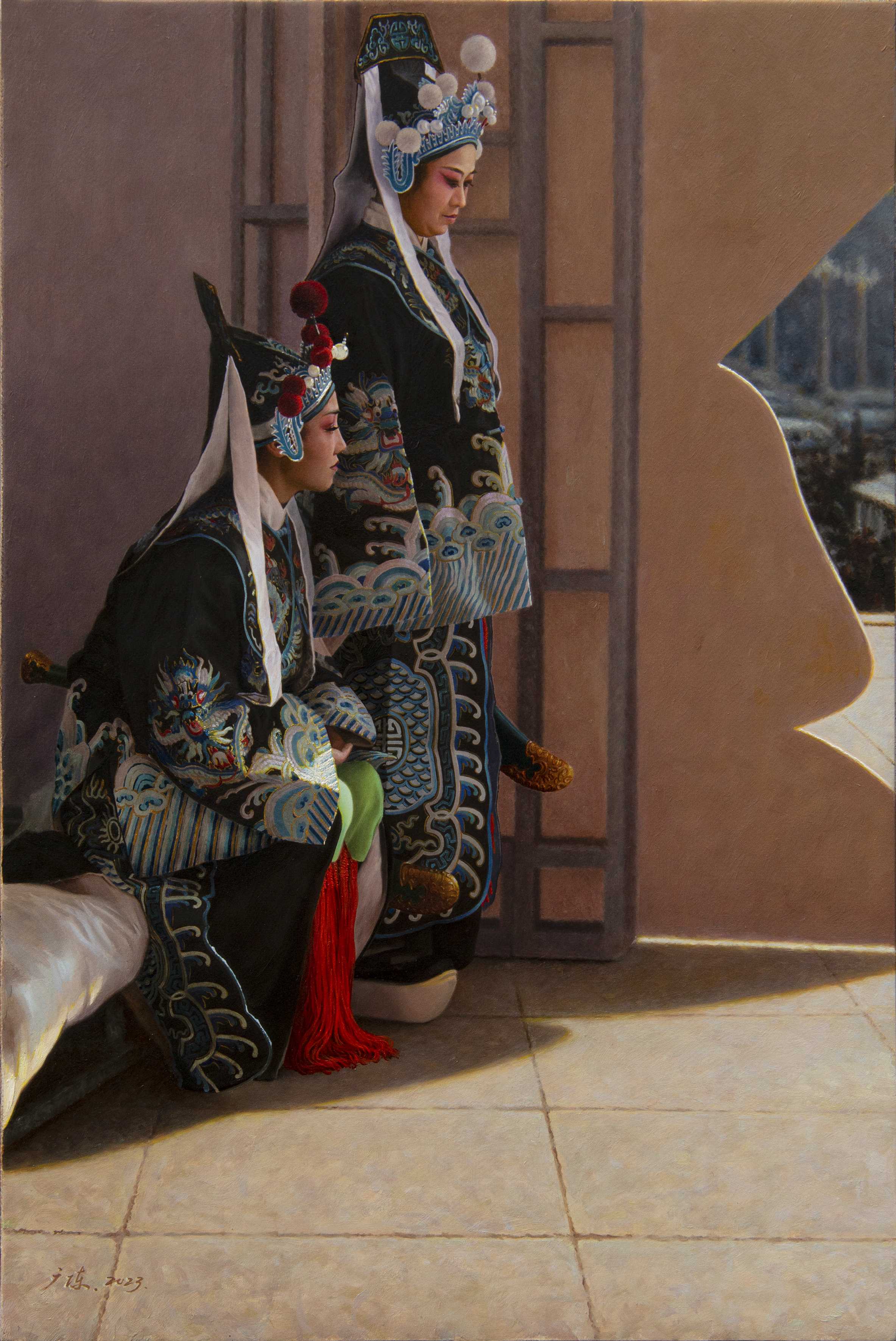 创作札记:《告庙》这张作品以传统戏曲剧目《打神告庙》中的人物为创作素材,在创作过程中我试图用逆光来表达人物精致优雅的动态美。轮廓线与边缘线在相当多的区域重合在一起,这种光线的变化是我要表达的重要方面。画面中绿、红、黑、白四个色块的对比关系,在程度上的把握比较困难,这让我想起了荷兰小画派中维米尔的小幅作品。我想:经典的写实艺术是穿越时空的永恒存在。更是吾辈终其一生之所求!