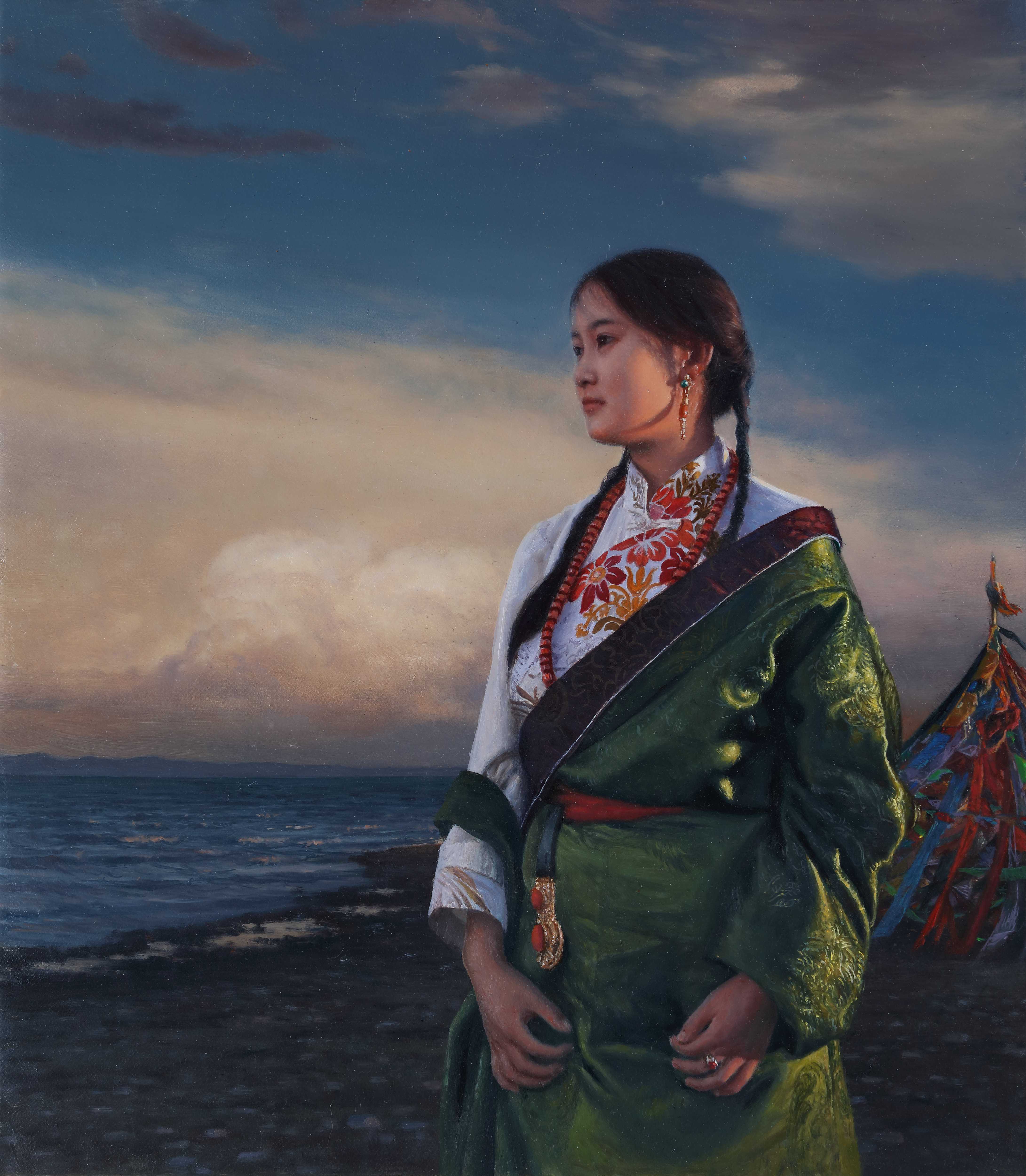 创作札记:《暮海》这幅画是我对一个藏族姑娘故事的延续和敬意,画面中善良纯真的美丽姑娘身穿藏族特色的服装, 站立在黄昏下的青海湖畔,。 她的眼神望向远方,宛如对未来的憧憬与期盼以及顽强的生命力。她的脸上洋溢出坚韧与乐观的情绪,折射出了生活带给她无数无尽挑战后的从容应对与积极面貌,展示了生命的力量和美好希望的主题。同时描述了这位女子的纯真和大海宁谧壮阔的气息之间的和谐感,并且赞美了她如海洋一样宽广内心世界。 身后遍插的经幡则代表着人们对未知世界的敬仰和对和谐共生愿望的心声,又像是举起了希望之光指引行进方向的手杖 在这个黄昏时刻的画面中,我倾注了我对大自然和平静生活的赞美与向往。同时又想描述那种孤独、沉思但又充满期待的情感状态——无论是对未来的新生活还是某种希望梦想的到来而感到孤寂的氛围。