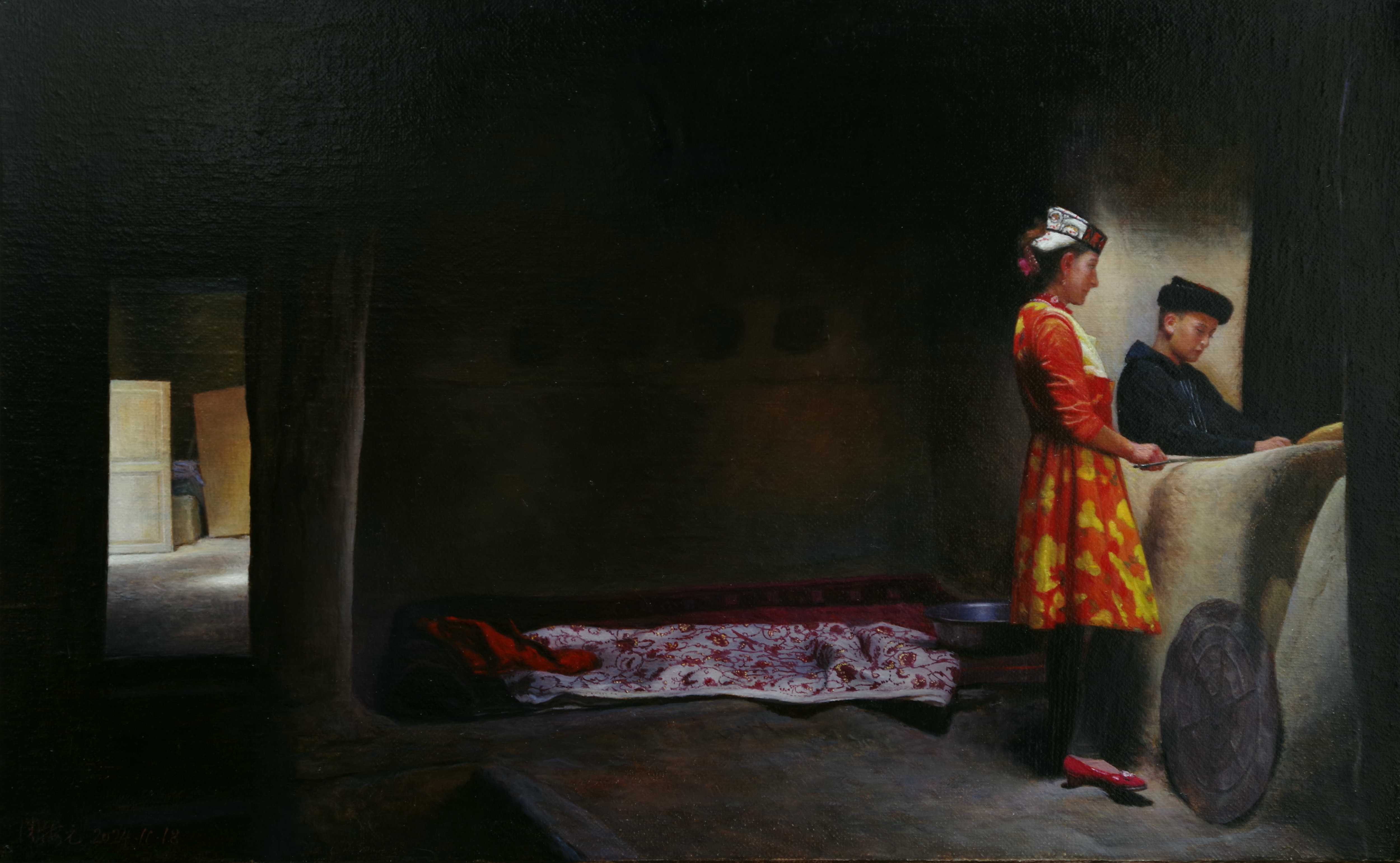创作札记:2018年夏,朋友约我去新疆帕米尔高原写生,原本计划去画些风景。从喀什到塔什库尔干,一路险峰连绵,风景壮美。后面在当地朋友带领下,我们深入到一些塔吉克村庄,那里还有一些保存完好土石砌成的老房子里,房顶有天窗。阳光透过天窗照在人物身上。光线地穿透感,对比强烈而又自然的色泽,和谐柔美的动态,在瞬间凝固为一幅幅端庄且崇高的画面。这正是我要的最好地素材。原计划在那里呆上一周,最后呆了半个月,画素描,拍照片。《和光》这张画就是源自于这批素材,作品背景大面积的深色处理和人物的光照效果会让人立刻联想到巴洛克时期惯见的油画语言。人物的写实处理因为房顶的天光形成聚光灯式的舞台布景而显得层次井然。描绘手法的细腻写实和黑白灰色调的大面积归纳概,为观者预留了许多遐想的空间。以富有感情的笔调深入描绘其日常的所见,同时赋予这些日常景观以人文关怀,这是个人的一贯追求。
