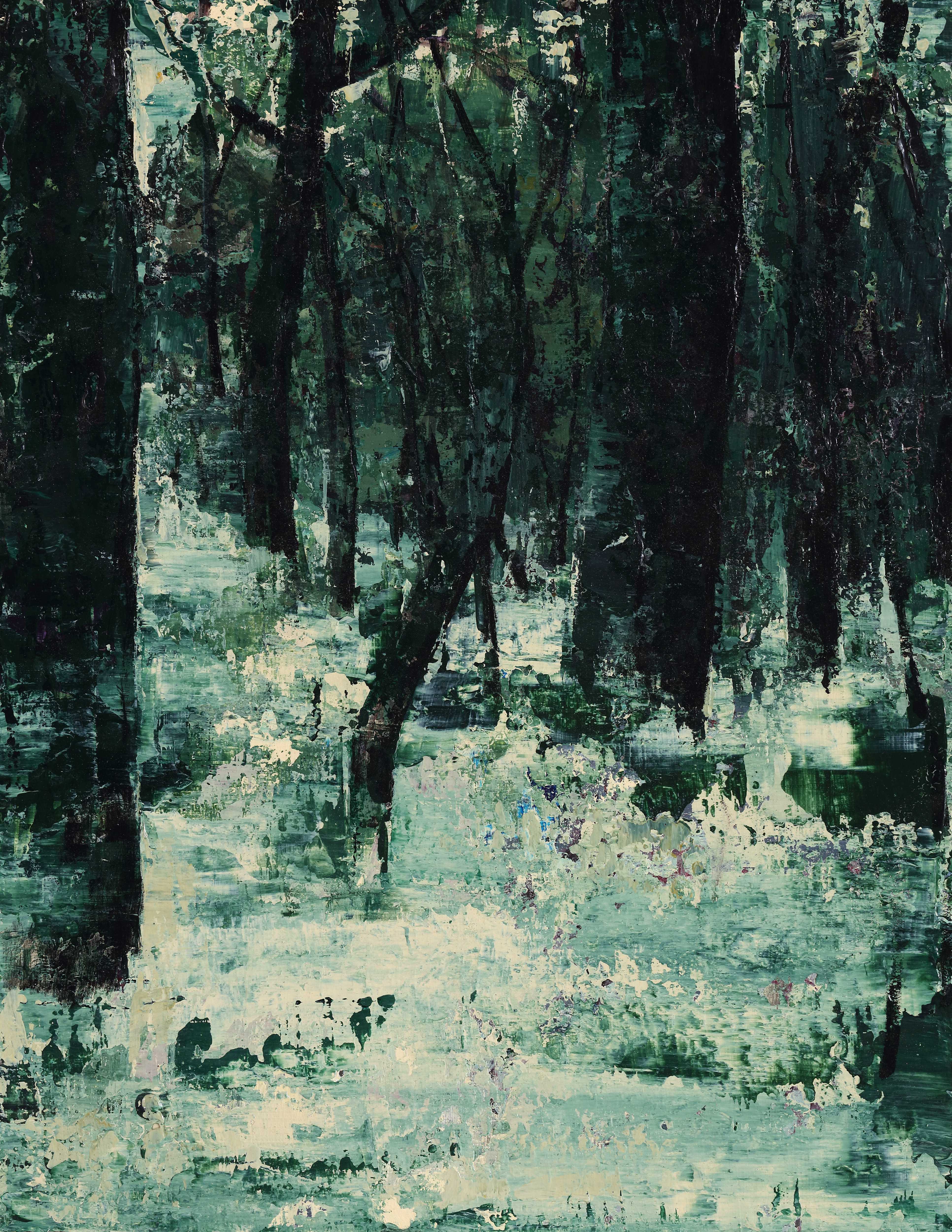 创作札记:这幅画作描绘了一个充满神秘感的森林场景。画面中,深绿色的树干和枝叶交织在一起,形成了一种幽深而宁静的氛围。光线透过树叶的缝隙,洒在地面上,形成斑驳的光影效果,给人一种梦幻般的感觉。画面的主题是自然与内心的宁静。通过抽象的表现手法,画家试图传达一种与自然和谐共处的情感。画面中的森林象征着内心的宁静与平和,同时也带有一丝神秘和未知的色彩。画面主要使用了深绿色和白色,这两种颜色的对比使得画面更加生动。深绿色的树干和枝叶形成了画面的主体,而白色的光影则为画面增添了层次感和深度。