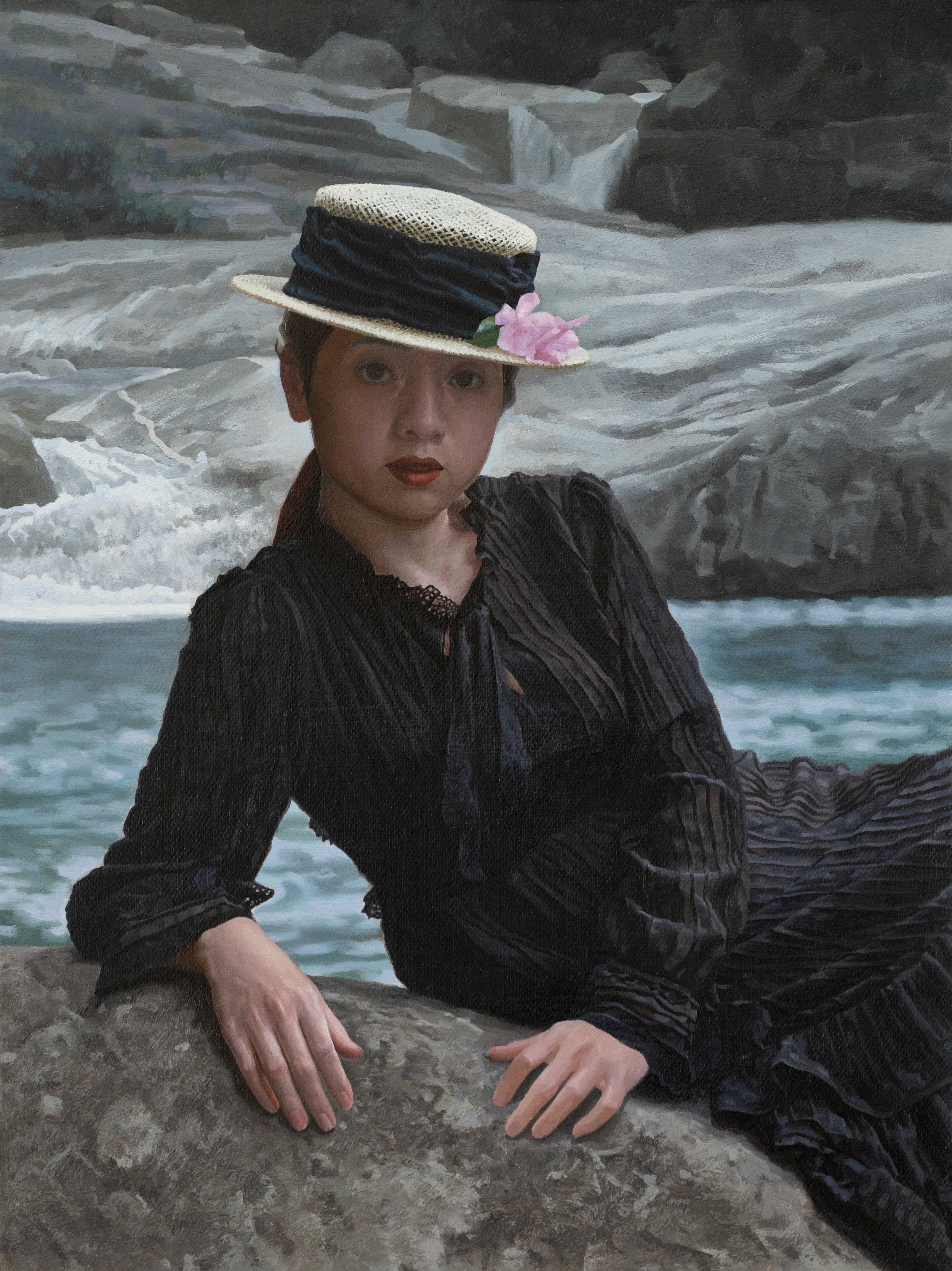 画中场景取自黄山一处开发失败的峡谷。开发失败不是因为自然环境不够优美,而是因为交通过于不便,开发成本太高而被放弃。对于这片山水来说却是好事,她的原始之美和远离喧嚣的静谧得以保留。具象写实的绘画也要用抽象的思维来经营。画中的色彩控制在一个低饱和度的色域中,强调画面中黑色衣服,灰色石头,白色水花等几个色块明度的对比。